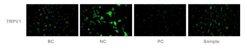 如图,绿色荧光代表TRPV1,颜色越深代表含量越高。从图中可以看出,样品组的TRPV1的含量显著降低,即可说明样品具有舒缓功效。