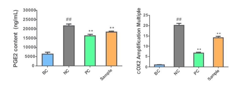 如图,样品组能够显著降低PGE2和COX2的表达,即可说明样品有舒缓功效。