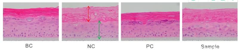 经过SLS刺激后的皮肤模型角质层分布变得疏松(图中红色箭头部分),同时活细胞层数减少(绿色箭头部分),而样品组的角质层疏松程度明显改善,对活细胞层数也有一定的改善作用,即可说明样品具有一定的舒缓功效。