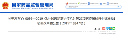 YY 0096-2019《钴-60远距离治疗机》等27项医疗器械行业标准和YY0285.3-2017《血管内导管 一次性使用无菌导管 第3部分:中心静脉导管》医疗器械行业标准第1号修改单已经审定通过,现予以公布。标准编号、名称、适用范围、实施日期和修改单内容见附件。